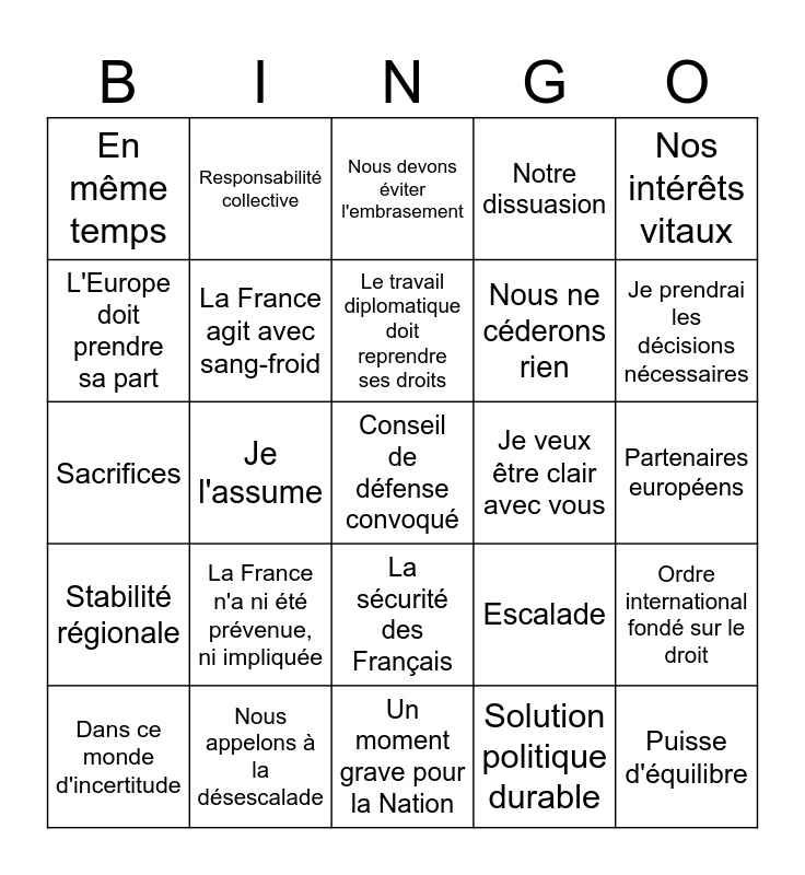 This bingo card has a free space and 24 words: La France n'a ni été prévenue, ni impliquée, Nous appelons à la désescalade, Le travail diplomatique doit reprendre ses droits, Dans ce monde d'incertitude, Nos intérêts vitaux, En même temps, L'Europe doit prendre sa part, Responsabilité collective, Je veux être clair avec vous, La sécurité des Français, Nous ne céderons rien, Sacrifices, Escalade, Ordre international fondé sur le droit, La France agit avec sang-froid, Solution politique durable, Partenaires européens, Nous devons éviter l'embrasement, Je prendrai les décisions nécessaires, Je l'assume, Puisse d'équilibre, Stabilité régionale, Notre dissuasion and Un moment grave pour la Nation.