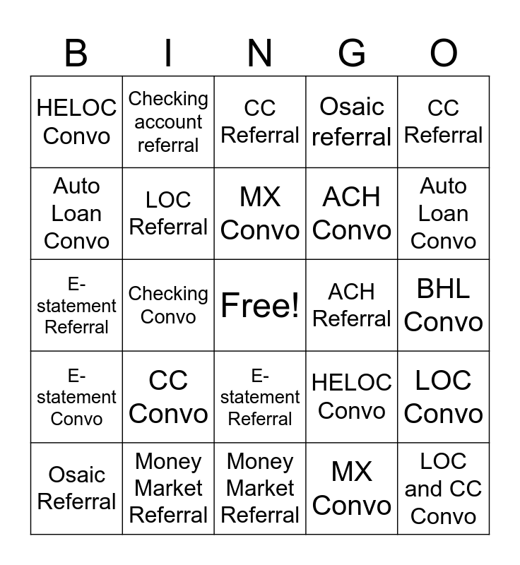 This bingo card has a free space and 24 words: CC Convo, Money Market Referral, MX Convo, Osaic Referral, CC Referral, HELOC Convo, Auto Loan Convo, Checking account referral, ACH Referral, E-statement Referral, ACH Convo, E-statement Referral, HELOC Convo, LOC Convo, LOC Referral, MX Convo, BHL Convo, CC Referral, Auto Loan Convo, Checking Convo, LOC and CC Convo, E-statement Convo, Osaic referral and Money Market Referral.