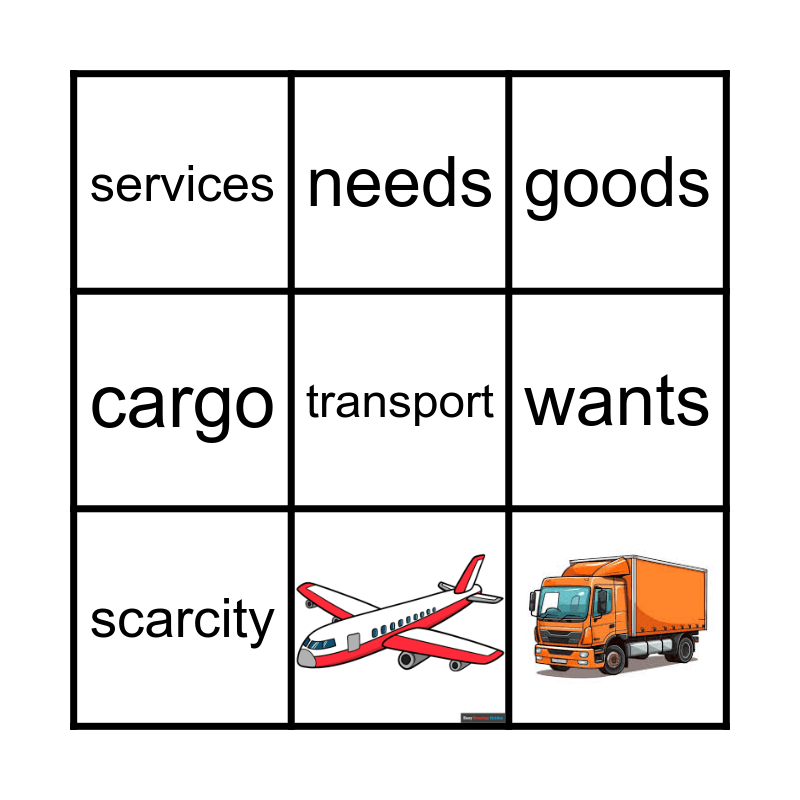 This bingo card has 2 images and 7 words: scarcity, goods, needs, cargo, services, wants and transport.
