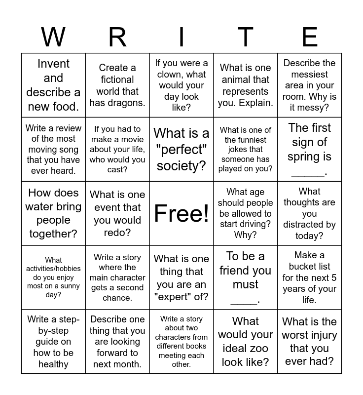 This bingo card has a free space and 24 words: Write a story where the main character gets a second chance., Describe one thing that you are looking forward to next month., What is a "perfect" society?, Write a step-by-step guide on how to be healthy, Describe the messiest area in your room. Why is it messy?, Invent and describe a new food., Write a review of the most moving song that you have ever heard., Create a fictional world that has dragons., What age should people be allowed to start driving? Why?, What is one thing that you are an "expert" of?, What is one of the funniest jokes that someone has played on you?, How does water bring people together?, To be a friend you must ____., Make a bucket list for the next 5 years of your life., If you had to make a movie about your life, who would you cast?, What would your ideal zoo look like?, What thoughts are you distracted by today?, If you were a clown, what would your day look like?, The first sign of spring is _____., What is one event that you would redo?, What is the worst injury that you ever had?, What activities/hobbies do you enjoy most on a sunny day?, What is one animal that represents you. Explain. and Write a story about two characters from different books meeting each other..