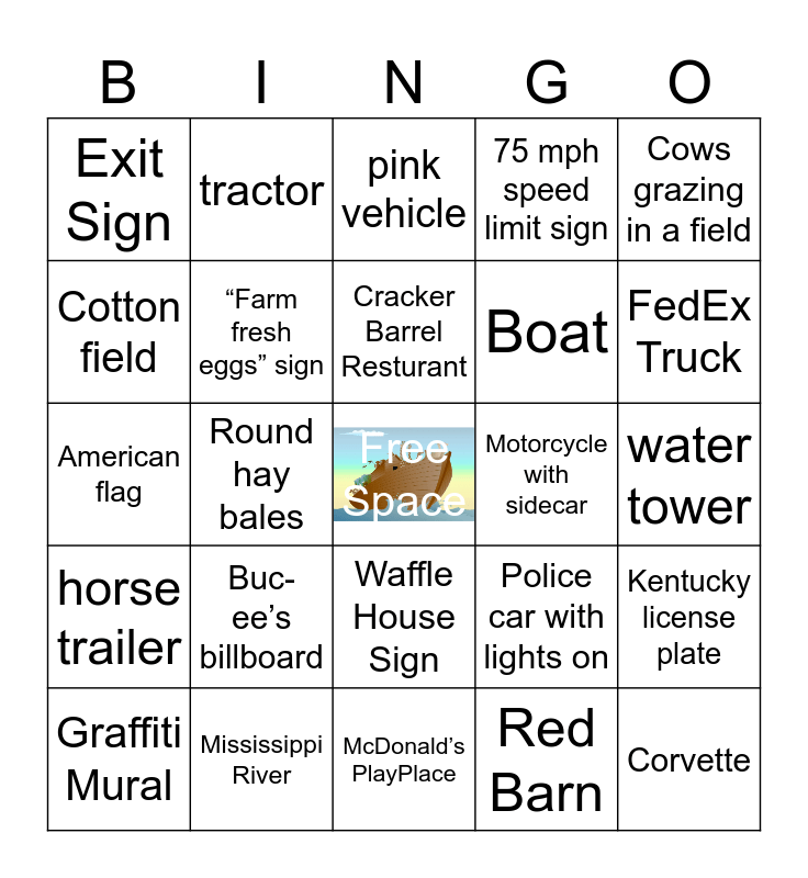 This bingo card has a free space and 24 words: Buc-ee’s billboard, Mississippi River, Cracker Barrel Resturant, Graffiti Mural, Cows grazing in a field, Exit Sign, Cotton field, tractor, Motorcycle with sidecar, Waffle House Sign, Boat, American flag, Police car with lights on, Kentucky license plate, “Farm fresh eggs” sign, Red Barn, water tower, pink vehicle, FedEx Truck, Round hay bales, Corvette, horse trailer, 75 mph speed limit sign and McDonald’s PlayPlace.