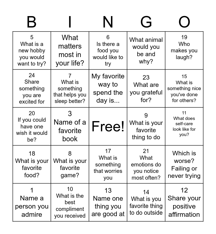 This bingo card has a free space and 29 words: 1 Name a person you admire, 2 Say something positive about you, 3 Name of a favorite book, 4 What makes you feel appreciated?, 5 What is a new hobby you would want to try?, 6 Is there a food you would like to try, 7 What is something that helps you sleep better?, 8 What is your favorite game?, 9 What is your favorite thing to do, 10 What is the best compliment you received, 11 What does self-care look like for you?, 12 Share your positive affirmation, 13 Name one thing you are good at, 14 What is you favorite thing to do outside, 15 What is something nice you've done for others?, 16 I am happiest when___, 17 What is something that worries you, 18 What is your favorite food?, 19 Who makes you laugh?, 20 If you could have one wish it would be?, 21 What emotions do you notice most often?, 22 Who do you enjoy calling or visiting?, 23 What are you grateful for?, 24 Share something you are excited for, What animal would you be and why?, What matters most in your life?, Which is worse? Failing or never trying, My favorite way to spend the day is... and I really wish others knew this about me....