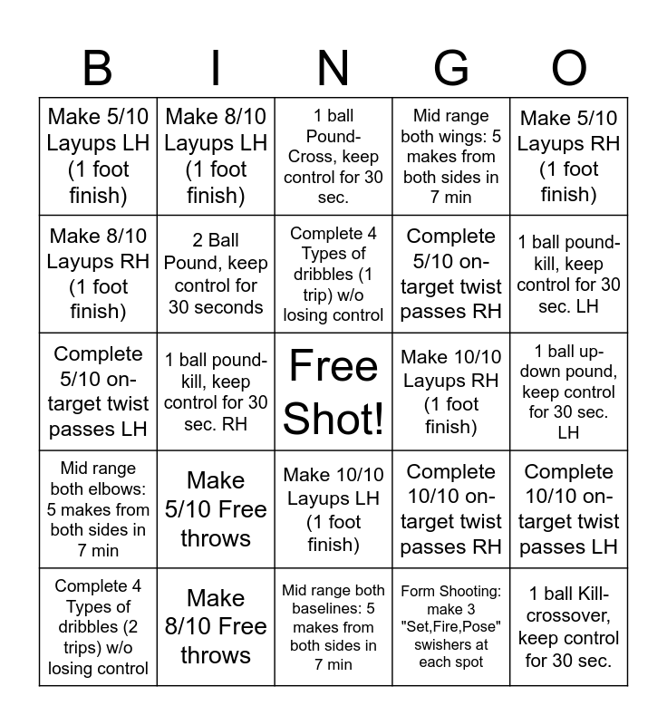 This bingo card has a free space and 24 words: Make 5/10 Free throws, Make 8/10 Free throws, Complete 4 Types of dribbles (1 trip) w/o losing control, Complete 4 Types of dribbles (2 trips) w/o losing control, Make 5/10 Layups RH (1 foot finish), Make 5/10 Layups LH (1 foot finish), Make 8/10 Layups RH (1 foot finish), Make 8/10 Layups LH (1 foot finish), Make 10/10 Layups RH (1 foot finish), Make 10/10 Layups LH (1 foot finish), Complete 5/10 on-target twist passes RH, Complete 5/10 on-target twist passes LH, Complete 10/10 on-target twist passes RH, Complete 10/10 on-target twist passes LH, 2 Ball Pound, keep control for 30 seconds, Form Shooting: make 3 "Set,Fire,Pose" swishers at each spot, 1 ball up-down pound, keep control for 30 sec. LH, 1 ball Pound-Cross, keep control for 30 sec., 1 ball pound-kill, keep control for 30 sec. LH, 1 ball pound-kill, keep control for 30 sec. RH, 1 ball Kill-crossover, keep control for 30 sec., Mid range both elbows: 5 makes from both sides in 7 min, Mid range both wings: 5 makes from both sides in 7 min and Mid range both baselines: 5 makes from both sides in 7 min.