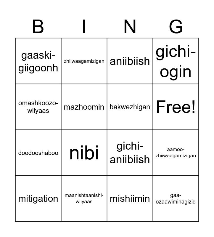 This bingo card has 17 words: mishiimin, mitigation, aniibiish, gaaski-giigoonh, nibi, gichi-ogin, aamoo-zhiiwaagamizigan, bakwezhigan, Free!, mazhoomin, maanishtaanishi-wiiyaas, gichi-aniibiish, omashkoozo-wiiyaas, zhiiwaagamizigan, doodooshaboo, opin and gaa-ozaawiminagizid.