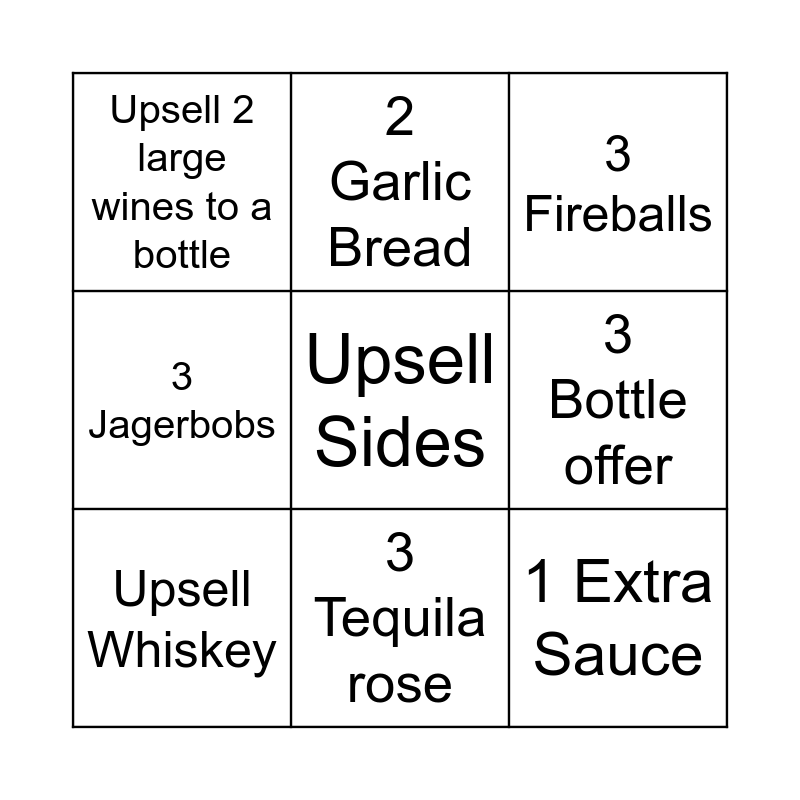 This bingo card has 18 words: Upsell Vodka, Upsell Desserts, 3 Fireballs, Upsell 2 large wines to a bottle, Upsell Starters, 3 Jagerbobs, Upsell Gin, 2 Garlic Bread, 3 Tequila rose, 1 Extra Sauce, Upsell Grazers, Upsell Sides, 2 Loaded Fries, 3 Bottle offer, Upsell Whiskey, Upsell Rum, 3 Cocktails and 1 Big Prosecco.