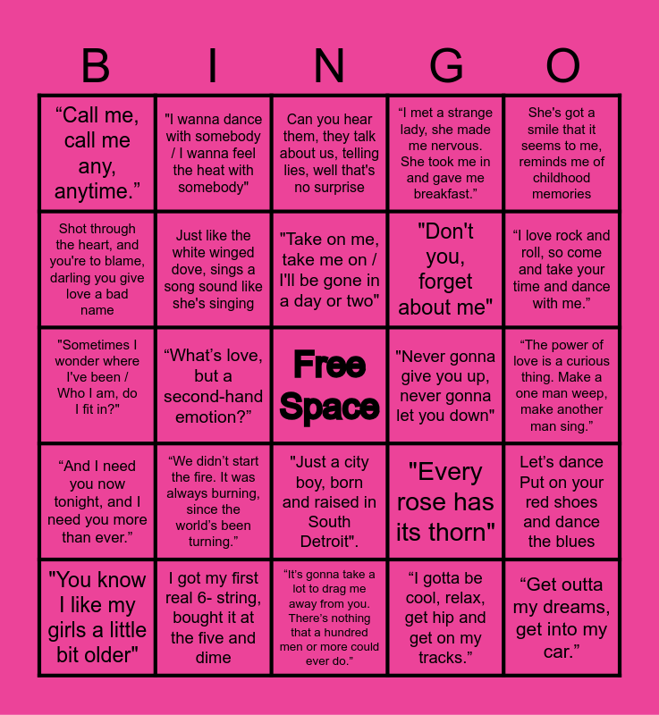 This bingo card has a free space and 24 words: “We didn’t start the fire. It was always burning, since the world’s been turning.”, I got my first real 6- string, bought it at the five and dime, "Take on me, take me on / I'll be gone in a day or two", "You know I like my girls a little bit older", She's got a smile that it seems to me, reminds me of childhood memories, “Call me, call me any, anytime.”, Shot through the heart, and you're to blame, darling you give love a bad name, "I wanna dance with somebody / I wanna feel the heat with somebody", "Never gonna give you up, never gonna let you down", "Just a city boy, born and raised in South Detroit"., "Don't you, forget about me", "Sometimes I wonder where I've been / Who I am, do I fit in?", "Every rose has its thorn", Let’s dance Put on your red shoes and dance the blues, Just like the white winged dove, sings a song sound like she's singing, “I gotta be cool, relax, get hip and get on my tracks.”, “The power of love is a curious thing. Make a one man weep, make another man sing.”, Can you hear them, they talk about us, telling lies, well that's no surprise, “I love rock and roll, so come and take your time and dance with me.”, “What’s love, but a second-hand emotion?”, “Get outta my dreams, get into my car.”, “And I need you now tonight, and I need you more than ever.”, “I met a strange lady, she made me nervous. She took me in and gave me breakfast.” and “It’s gonna take a lot to drag me away from you. There’s nothing that a hundred men or more could ever do.”.