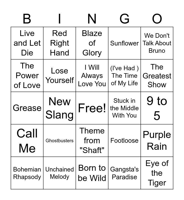 This bingo card has a free space and 39 words: I'm Alright, Earned It, Happy, Lose Yourself, Bohemian Rhapsody, Theme from "Shaft", I Will Always Love You, My Heart Will Go On, We Don't Talk About Bruno, Call Me, New Slang, Sunflower, Eye of the Tiger, 9 to 5, Stuck in the Middle With You, Ghostbusters, Flashdance ...What a Feeling, Live and Let Die, Don't You (Forget About Me), Footloose, The Power of Love, Born to be Wild, (I've Had ) The Time of My Life, The Greatest Show, That Thing You Do, Man on the Moon, Lovefool, La Bamba, I Have the Touch, Red Right Hand, You Could Be Mine, Be Our Guest, Blaze of Glory, Unchained Melody, Gangsta's Paradise, Lady Marmalade, Purple Rain, Grease and Mamma Mia!.