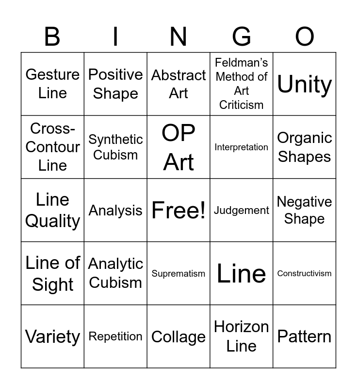 This bingo card has a free space and 31 words: Collage, Description, Analysis, Contour Line, Gesture Line, Abstract Art, Synthetic Cubism, Line, Judgement, Horizon Line, Negative Shape, Pattern, Geometric Shapes, Decoupage, Organic Shapes, Cubism, Constructivism, Analytic Cubism, Line of Sight, Suprematism, Unity, Line Personality, Variety, Positive Shape, Interpretation, Cross-Contour Line, Feldman’s Method of Art Criticism, Line Quality, Repetition, OP Art and Rhythm.