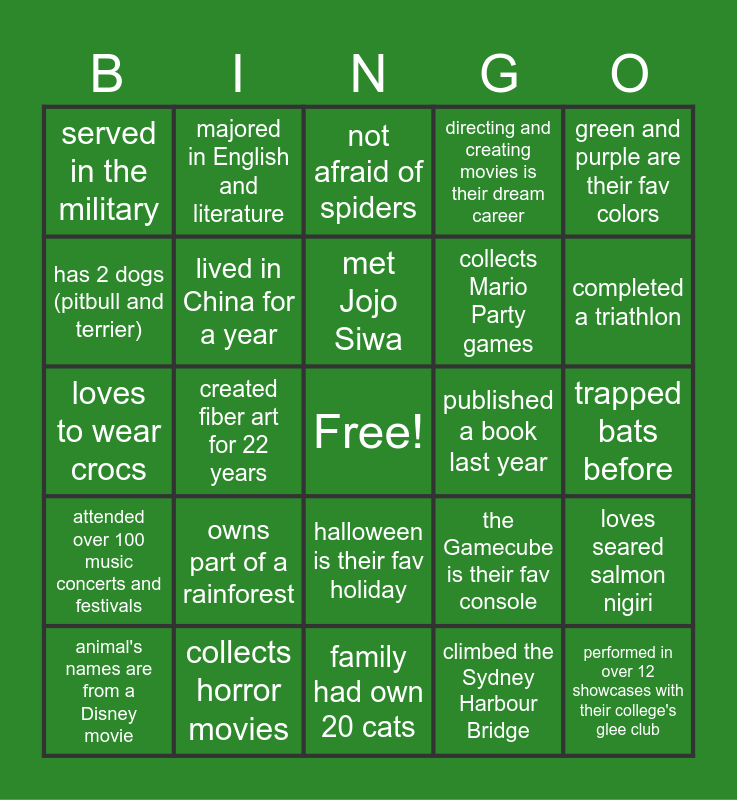 This bingo card has a free space and 24 words: owns part of a rainforest, collects horror movies, met Jojo Siwa, animal's names are from a Disney movie, green and purple are their fav colors, served in the military, has 2 dogs (pitbull and terrier), majored in English and literature, published a book last year, halloween is their fav holiday, collects Mario Party games, loves to wear crocs, the Gamecube is their fav console, loves seared salmon nigiri, lived in China for a year, climbed the Sydney Harbour Bridge, trapped bats before, not afraid of spiders, completed a triathlon, created fiber art for 22 years, performed in over 12 showcases with their college's glee club, attended over 100 music concerts and festivals, directing and creating movies is their dream career and family had own 20 cats.