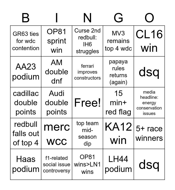 This bingo card has a free space and 24 words: merc wcc, f1-related social issue controversy, ferrari improves constructors, Haas podium, CL16 win, GR63 ties for wdc contention, AA23 podium, OP81 sprint win, 15 min+ red flag, top team mid-season dip, papaya rules returns (again), cadillac double points, KA12 win, 5+ race winners, AM double dnf, LH44 podium, media headline: energy conservation issues, Curse 2nd redbull: IH6 struggles, dsq, Audi double points, dsq, redbull falls out of top 4, MV3 remains top 4 wdc and OP81 wins>LN1 wins.