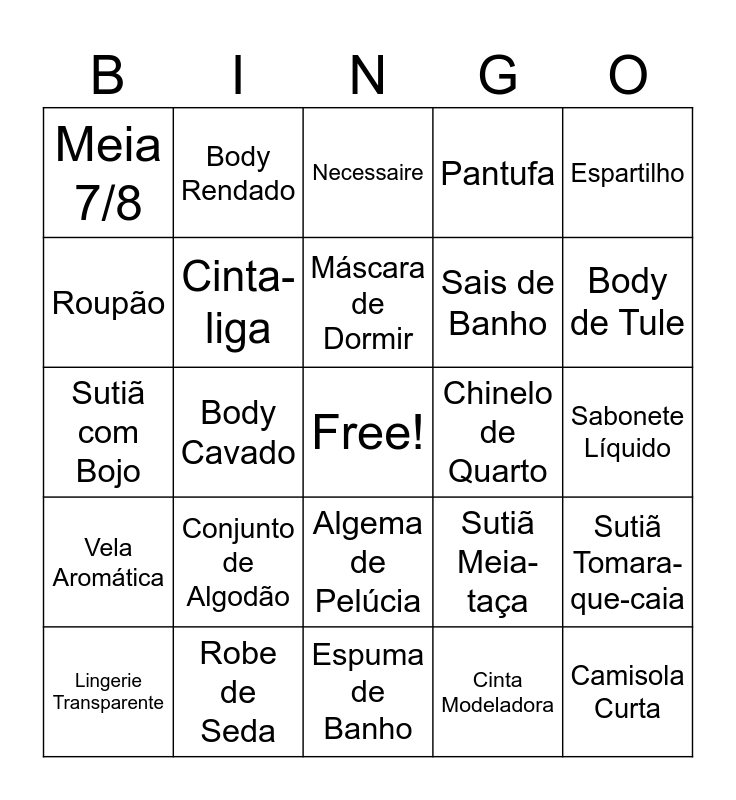 This bingo card has a free space and 40 words: Calcinha de Renda, Sutiã com Bojo, Baby Doll, Cinta-liga, Robe de Seda, Algema de Pelúcia, Máscara de Dormir, Óleo Corporal, Espartilho, Vela Aromática, Body Cavado, Pantufa, Camisola Curta, Sabonete Líquido, Chinelo de Quarto, Conjunto de Algodão, Hidratante, Meia 7/8, Calcinha Fio Dental, Necessaire, Sutiã Tomara-que-caia, Cinta Modeladora, Sais de Banho, Roupão, Corset, Caleçon, Top de Renda, Tanguinha, Creme de Massagem, Luvas de Renda, Short Doll, Lingerie Transparente, Calcinha Sem Costura, Sutiã Meia-taça, Body de Tule, Espuma de Banho, Choker de Veludo, Tiara de Noiva, Body Rendado and Cinta Abdominal.
