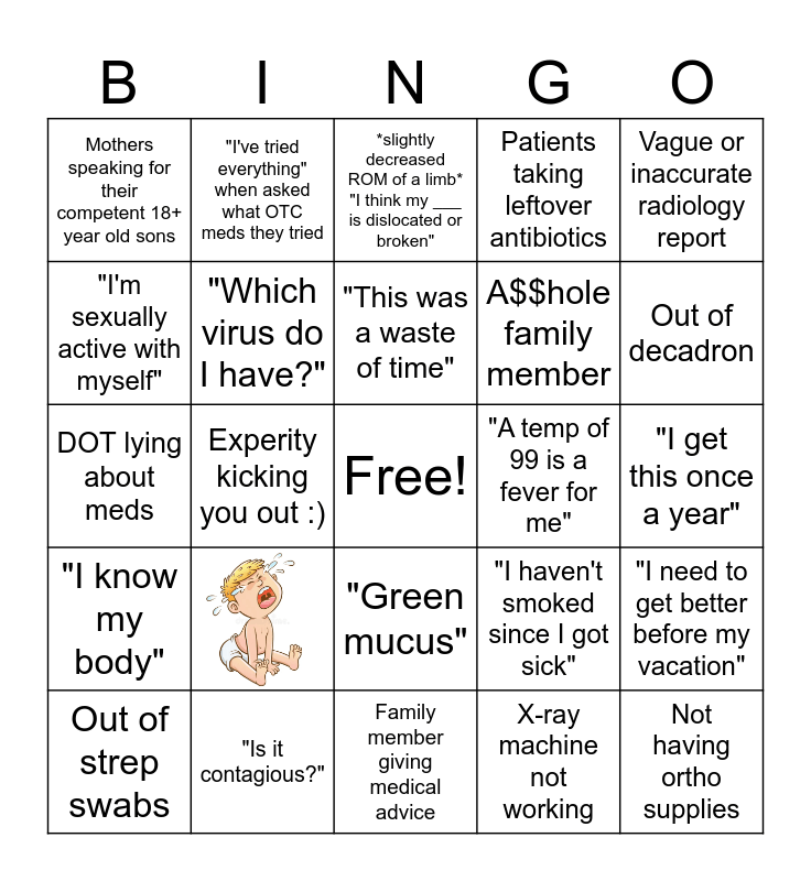 This bingo card has 1 images, a free space and 50 words: "I never get sick", Not having ortho supplies, 5+ Twofers in one day, Family member giving medical advice, Dentist complaint, "I've tried everything" when asked what OTC meds they tried, "I didn't try anything, I wanted to come to you first", "I'm sexually active with myself", "Can I see the doctor?", "Which virus do I have?", Patients taking leftover antibiotics, "I need to get better before my vacation", "I haven't smoked since I got sick", "I'm allergic to (antibiotic)" and clearly is not an allergy, "I want my kid's ears checked", "This was a waste of time", "A temp of 99 is a fever for me", STAT imaging not being read STAT, Vague or inaccurate radiology report, Experity kicking you out :), X-ray machine not working, Mothers speaking for their competent 18+ year old sons, A$$hole family member, A$$hole patient, *Looking into the patient's ear* "Did you see the wall?", Out of decadron, Out of covid/flu tests, Out of strep swabs, *slightly decreased ROM of a limb* "I think my ___ is dislocated or broken", *patient does nothing we told them to at the last visit* "I don't know why I'm not better", 3+ family members coming in at once for one day of coughing, Lac walking in at 8:55PM, Being short on FD or MA staff, "You guys are my PCP", "Is it contagious?", *URI symptom started today* "I need an antibiotic", "Nip it in the bud", *Obvious ER complaint* "My doctor told me to come here", *moments after being told they are all set* "Am I all set?", "I get this once a year", "I know my body", "At least it's not COVID", *Has viral infection* "I just wanted to make sure I wasn't contagious", Need controlled substance license w/ DOT, Need monocular vision form w/ DOT, DOT lying about meds, New onset DM w/ DOT, Primary Care Complaint, "Green mucus" and "I thought you forgot about me".
