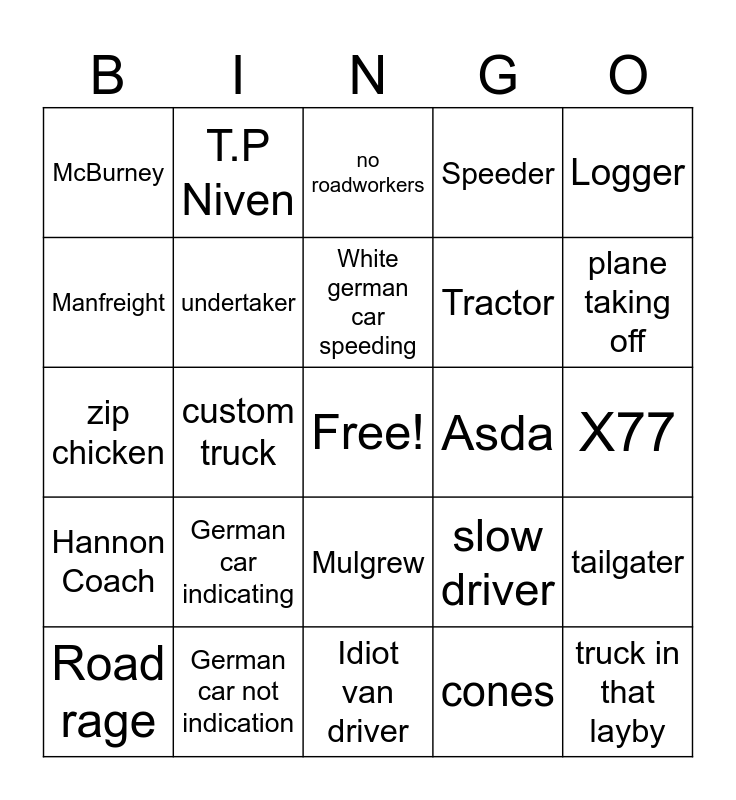 This bingo card has a free space and 24 words: German car indicating, German car not indication, White german car speeding, Road rage, Logger, McBurney, Manfreight, T.P Niven, Asda, Mulgrew, Tractor, zip chicken, slow driver, tailgater, undertaker, cones, X77, no roadworkers, plane taking off, custom truck, truck in that layby, Hannon Coach, Speeder and Idiot van driver.