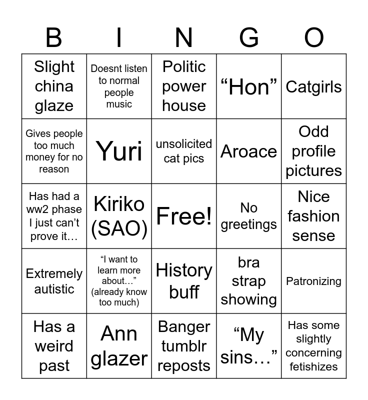 This bingo card has a free space and 24 words: “I want to learn more about…” (already know too much), Ann glazer, unsolicited cat pics, Has a weird past, Catgirls, Slight china glaze, Gives people too much money for no reason, Doesnt listen to normal people music, No greetings, History buff, Aroace, Has had a ww2 phase I just can’t prove it…, bra strap showing, Patronizing, Yuri, “My sins…”, Nice fashion sense, Politic power house, Odd profile pictures, Kiriko (SAO), Has some slightly concerning fetishizes, Extremely autistic, “Hon” and Banger tumblr reposts.