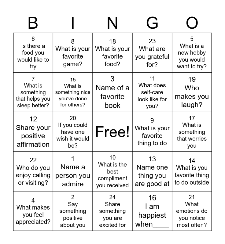 This bingo card has a free space and 24 words: 1 Name a person you admire, 2 Say something positive about you, 3 Name of a favorite book, 4 What makes you feel appreciated?, 5 What is a new hobby you would want to try?, 6 Is there a food you would like to try, 7 What is something that helps you sleep better?, 8 What is your favorite game?, 9 What is your favorite thing to do, 10 What is the best compliment you received, 11 What does self-care look like for you?, 12 Share your positive affirmation, 13 Name one thing you are good at, 14 What is you favorite thing to do outside, 15 What is something nice you've done for others?, 16 I am happiest when____, 17 What is something that worries you, 18 What is your favorite food?, 19 Who makes you laugh?, 20 If you could have one wish it would be?, 21 What emotions do you notice most often?, 22 Who do you enjoy calling or visiting?, 23 What are you grateful for? and 24 Share something you are excited for.