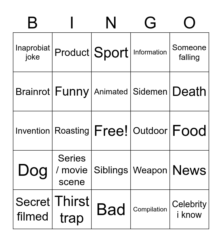 This bingo card has a free space and 24 words: Series / movie scene, Thirst trap, Animated, Secret filmed, Someone falling, Inaprobiat joke, Brainrot, Product, Outdoor, Siblings, Sidemen, Invention, Weapon, News, Funny, Compilation, Food, Sport, Death, Roasting, Celebrity i know, Dog, Information and Bad.