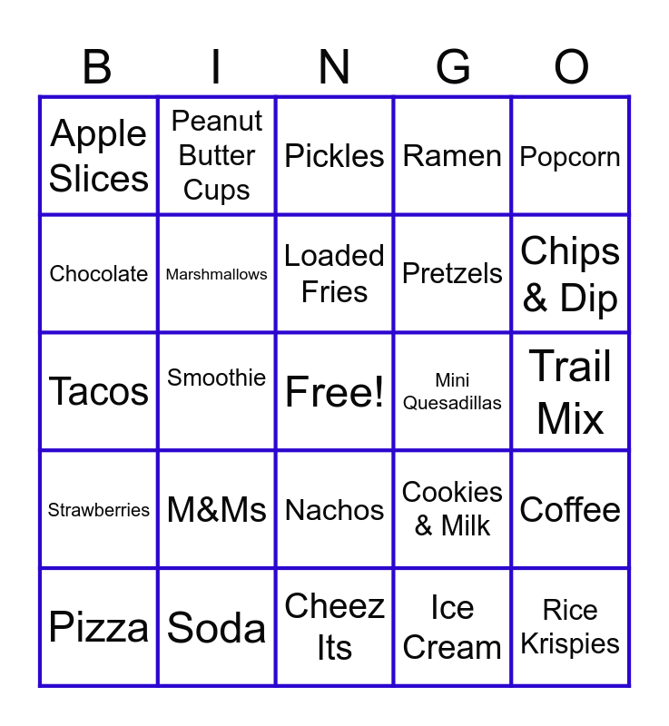 This bingo card has a free space and 24 words: M&Ms, Soda, Loaded Fries, Pizza, Popcorn, Apple Slices, Chocolate, Peanut Butter Cups, Mini Quesadillas, Nachos, Pretzels, Tacos, Cookies & Milk, Coffee, Marshmallows, Ice Cream, Trail Mix, Pickles, Chips & Dip, Smoothie, Rice Krispies, Strawberries, Ramen and Cheez Its.