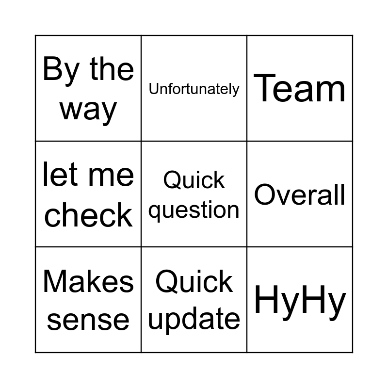This bingo card has a free space and 8 words: Overall, Team, Unfortunately, Makes sense, By the way, HyHy, let me check and Quick update.