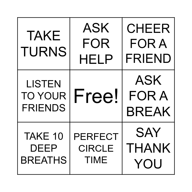 This bingo card has a free space and 16 words: SHARE A TOY, USE TEAMWORK, CHEER FOR A FRIEND, TAKE TURNS, LET A FRIEND GO FIRST, ASK FOR HELP, RAISE MY HAND, WALK AWAY, SAY THANK YOU, ASK FOR A BREAK, ASK A FRIEND TO PLAY, LISTEN TO YOUR FRIENDS, SAY SORRY, PERFECT CIRCLE TIME, TAKE 10 DEEP BREATHS and SAY SOMETHING KIND.
