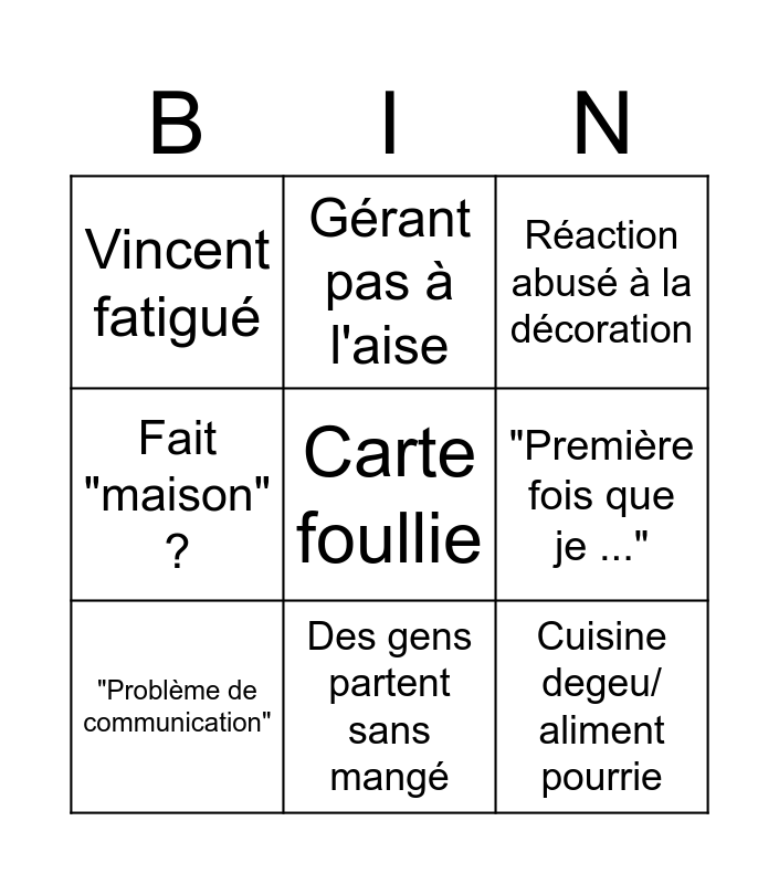 This bingo card has a free space and 8 words: "Première fois que je ...", Réaction abusé à la décoration, Gérant pas à l'aise, "Problème de communication", Vincent fatigué, Cuisine degeu/ aliment pourrie, Fait "maison" ? and Des gens partent sans mangé.