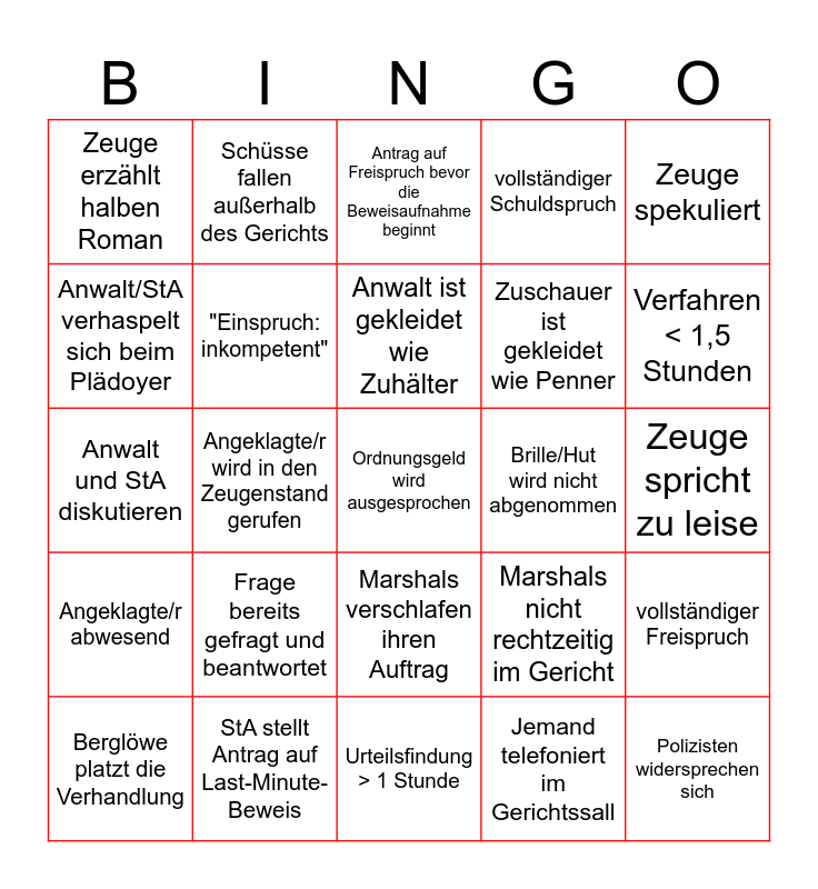 This bingo card has 30 words: StA stellt Antrag auf Last-Minute-Beweis, Richter wird beleidigt, Angeklagte/r wird in den Zeugenstand gerufen, StA verkackt Beweisführung, Zeuge erzählt halben Roman, Antrag auf Freispruch bevor die Beweisaufnahme beginnt, "Einspruch: inkompetent", Marshals verschlafen ihren Auftrag, Brille/Hut wird nicht abgenommen, Urteilsfindung > 1 Stunde, Zeuge spricht zu leise, Ordnungsgeld wird ausgesprochen, Jemand telefoniert im Gerichtssall, Polizisten widersprechen sich, Verfahren < 1,5 Stunden, "Ich kann mich nicht erinnern"/Ich weiß nicht mehr", Marshals nicht rechtzeitig im Gericht, Angeklagte/r abwesend, Frage bereits gefragt und beantwortet, Zeuge spekuliert, Anwalt und StA diskutieren, Zeuge nicht anwesend, Schüsse fallen außerhalb des Gerichts, Zuschauer ist gekleidet wie Penner, Anwalt/StA verhaspelt sich beim Plädoyer, vollständiger Schuldspruch, vollständiger Freispruch, Berglöwe platzt die Verhandlung, Anwalt ist gekleidet wie Zuhälter and Jemand sperrt sich im Büro des Gewerbeamts ein.