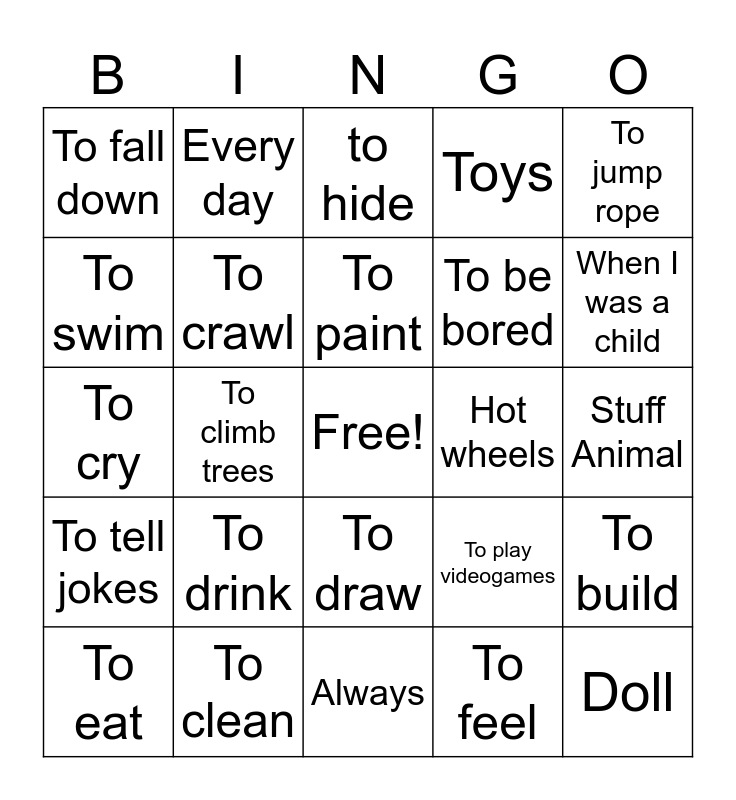 This bingo card has a free space and 40 words: To play, To cry, To use, To crawl, To clean, To draw, To paint, To get mad, To jump rope, To tell jokes, To climb trees, Toys, Doll, Stuff Animal, Hot wheels, To drink, To do, To fall down, To run, to hide, To build, To feel, To be bored, To swim, To study, To practice, To listen to music, To Dance, To walk, To buy, Fun, To eat, To fight, To play videogames, When I was a child, Always, Never, Sometimes, Every day and Every summer.