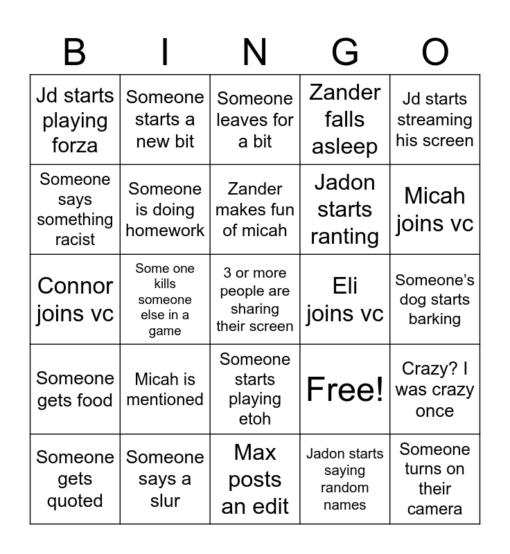 This bingo card has 25 words: Micah is mentioned, Max posts an edit, Zander makes fun of micah, Someone gets quoted, Jd starts streaming his screen, Jd starts playing forza, Someone says something racist, Someone starts a new bit, Eli joins vc, Someone starts playing etoh, Jadon starts ranting, Connor joins vc, Free!, Crazy? I was crazy once, Someone is doing homework, Someone turns on their camera, Someone’s dog starts barking, Someone leaves for a bit, Micah joins vc, Some one kills someone else in a game, 3 or more people are sharing their screen, Someone says a slur, Someone gets food, Zander falls asleep and Jadon starts saying random names.