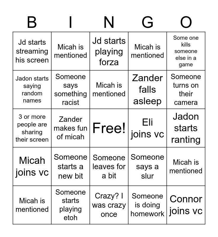 This bingo card has a free space and 29 words: Micah is mentioned, Max posts an edit, Zander makes fun of micah, Someone gets quoted, Jd starts streaming his screen, Jd starts playing forza, Someone says something racist, Someone starts a new bit, Eli joins vc, Someone starts playing etoh, Jadon starts ranting, Connor joins vc, Crazy? I was crazy once, Someone is doing homework, Someone turns on their camera, Someone’s dog starts barking, Someone leaves for a bit, Micah joins vc, Some one kills someone else in a game, 3 or more people are sharing their screen, Someone says a slur, Someone gets food, Zander falls asleep, Jadon starts saying random names, Micah is mentioned, Micah is mentioned, Micah is mentioned, Micah is mentioned and Micah is mentioned.
