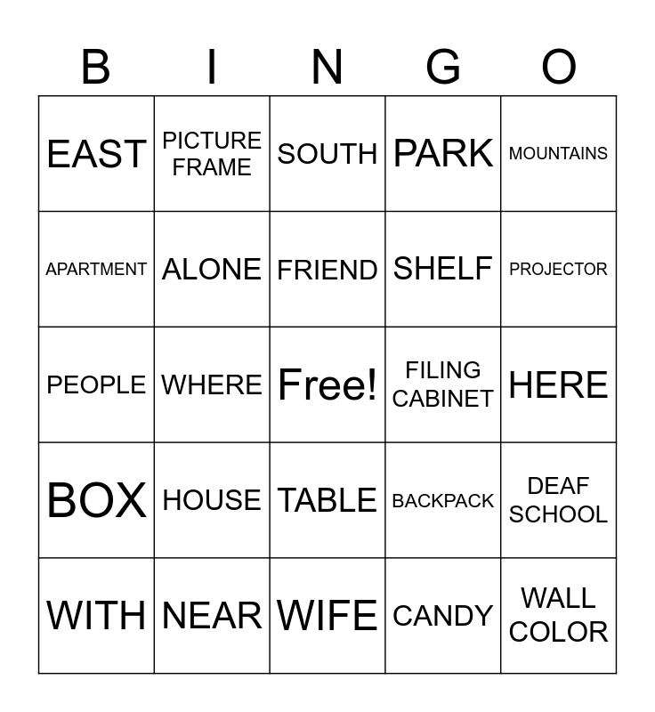 This bingo card has a free space and 70 words: LIVE, HERE, AREA, DOWNTOWN, NEAR, FAR, PARK, HILLS, MOUNTAINS, SHOPPING, DEAF SCHOOL, NORTH, EAST, SOUTH, WEST, WHERE, TABLE, SHELF, TRASH CAN, BOX, FILING CABINET, BACKPACK, PROJECTOR, TV, PEN, PAPER, BOOK, APPLE, CANDY, CUP, PICTURE FRAME, PHONE, SHOES, GLASSES, LAPTOP, BIG, KINDA BIG, KINDA SMALL, SMALL, APARTMENT, CONDO, HOUSE, WALL COLOR, WINDOW TRIM, LIVE, ALONE, WITH, FAMILY, MOTHER, FATHER, PARENTS, SON, DAUGHTER, CHILDREN, WIFE, HUSBAND, FRIEND, BOYFRIEND, GIRLFRIEND, ROOMMATE, PEOPLE, ANIMAL, CAT, DOG, BIRD, FISH, TURTLE, RAT, RABBIT and PET.