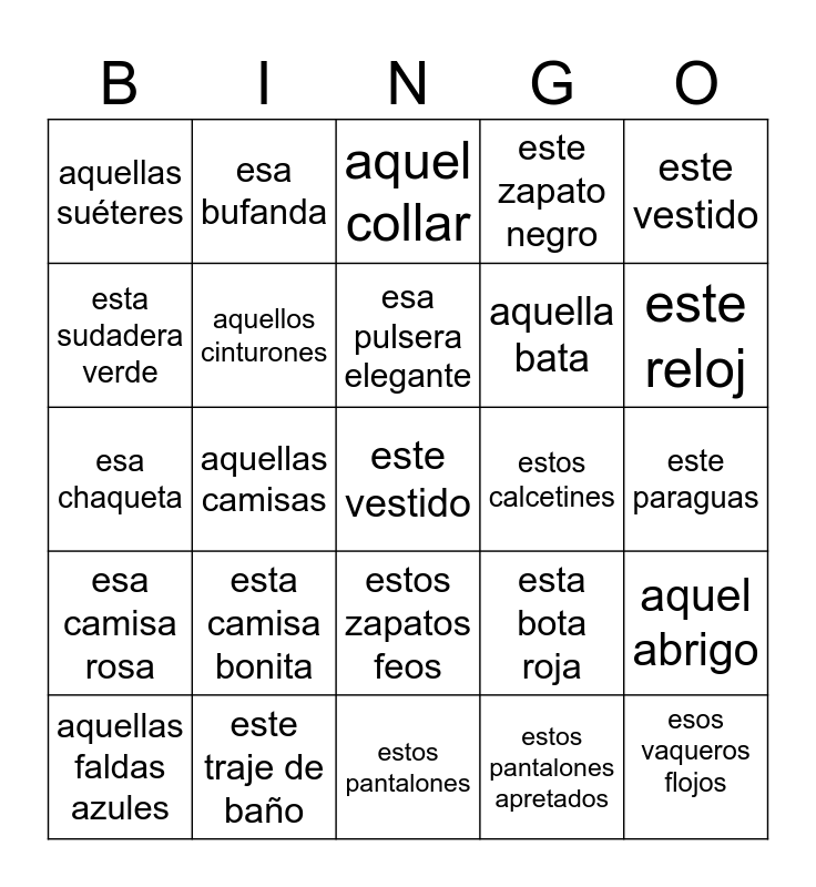 This bingo card has 25 words: esta camisa bonita, estos pantalones, esa pulsera elegante, aquellas faldas azules, este vestido, aquellas suéteres, esta sudadera verde, esa bufanda, estos calcetines, estos zapatos feos, aquella bata, esa chaqueta, esta bota roja, aquel abrigo, aquellos cinturones, esos vaqueros flojos, este paraguas, aquel collar, este reloj, aquellas camisas, este vestido, este traje de baño, esa camisa rosa, este zapato negro and estos pantalones apretados.