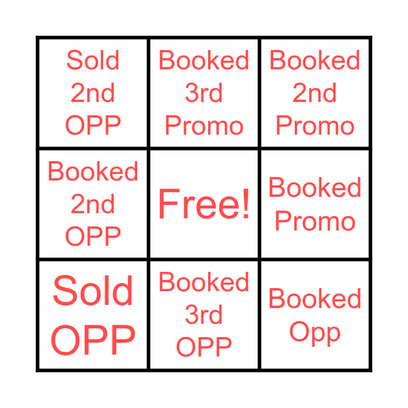 This bingo card has a free space and 8 words: Booked Promo, Booked 2nd Promo, Booked 3rd Promo, Sold OPP, Sold 2nd OPP, Booked Opp, Booked 2nd OPP and Booked 3rd OPP.