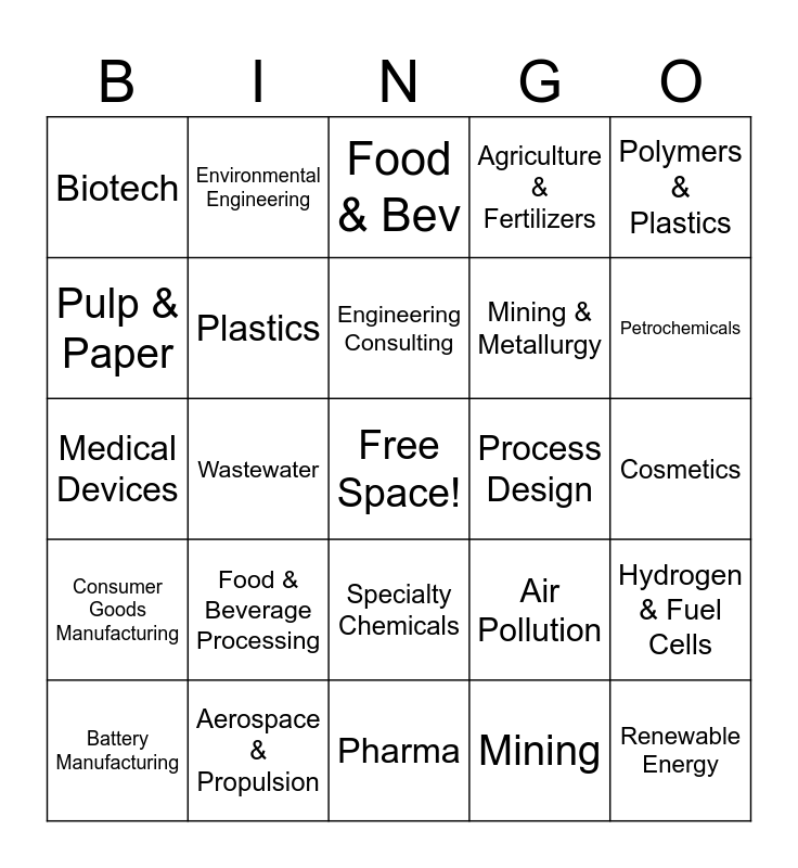 This bingo card has a free space and 31 words: Pharma, R&D, Wastewater, Nuclear, Biotech, Food & Bev, Plastics, Air Pollution, Process Design, Mining, Cosmetics, Renewable Energy, Chemical Manufacturing, Oil & Gas, Petrochemicals, Renewable Energy, Hydrogen & Fuel Cells, Food & Beverage Processing, Consumer Goods Manufacturing, Specialty Chemicals, Polymers & Plastics, Semiconductor Manufacturing, Battery Manufacturing, Environmental Engineering, Mining & Metallurgy, Pulp & Paper, Agriculture & Fertilizers, Medical Devices, Aerospace & Propulsion, Engineering Consulting and Carbon Capture.