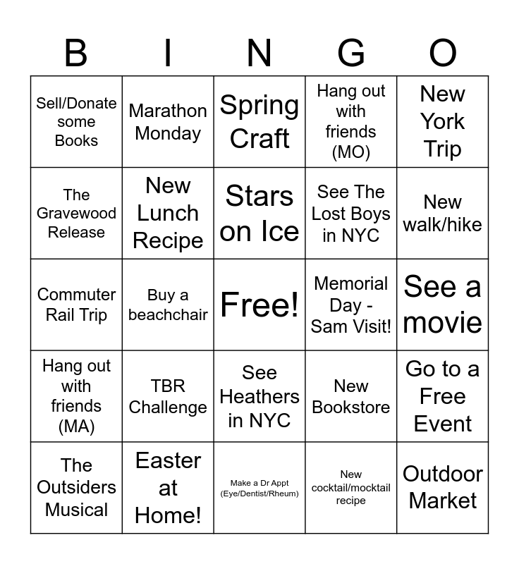 This bingo card has a free space and 24 words: TBR Challenge, Easter at Home!, Stars on Ice, The Outsiders Musical, New York Trip, Sell/Donate some Books, The Gravewood Release, Marathon Monday, Memorial Day - Sam Visit!, See Heathers in NYC, See The Lost Boys in NYC, Commuter Rail Trip, New Bookstore, Go to a Free Event, New Lunch Recipe, New cocktail/mocktail recipe, See a movie, Spring Craft, New walk/hike, Buy a beachchair, Outdoor Market, Hang out with friends (MA), Hang out with friends (MO) and Make a Dr Appt (Eye/Dentist/Rheum).