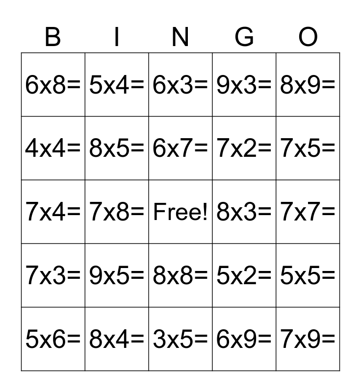 This bingo card has a free space and 27 words: 5x2=, 3x4=, 7x2=, 3x5=, 4x4=, 6x3=, 5x4=, 7x3=, 8x3=, 5x5=, 7x4=, 9x3=, 5x6=, 8x4=, 7x5=, 6x6=, 8x5=, 6x7=, 9x5=, 6x8=, 7x7=, 6x9=, 7x8=, 7x9=, 8x8=, 8x9= and 9x9=.