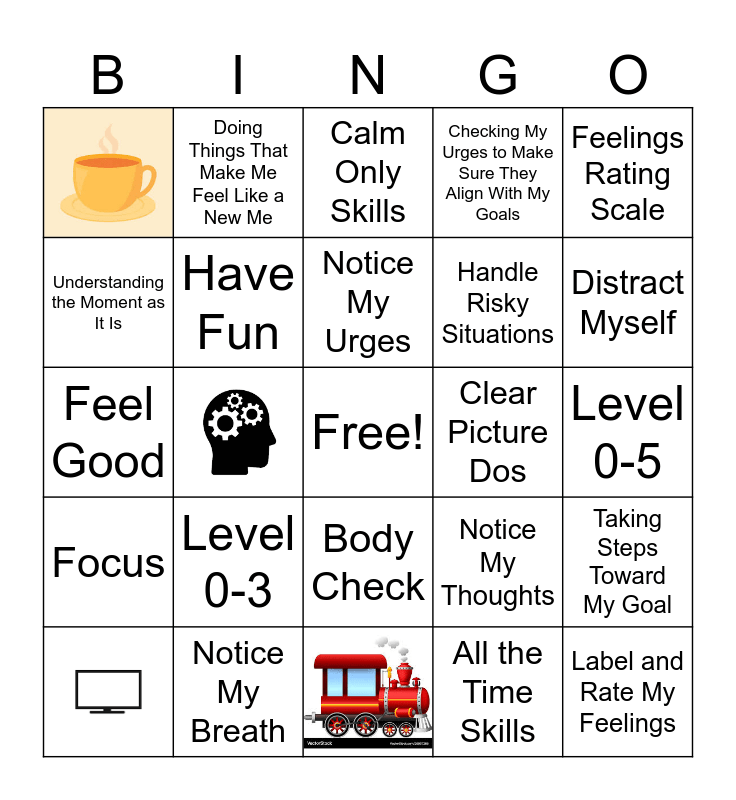 This bingo card has 5 images, a free space and 24 words: Notice My Surroundings, 9, Calm Only Skills, Have Fun, Level 0-3, Clear Picture Dos, Notice My Breath, Level 0-5, Label and Rate My Feelings, All the Time Skills, Distract Myself, Body Check, Focus, Feelings Rating Scale, Feel Good, Notice My Thoughts, Level of Emotion + 1 = How Many Skills I Should Use, Handle Risky Situations, Understanding the Moment as It Is, Checking My Urges to Make Sure They Align With My Goals, Doing Things That Make Me Feel Like a New Me, Taking Steps Toward My Goal, Notice My Urges and 6.