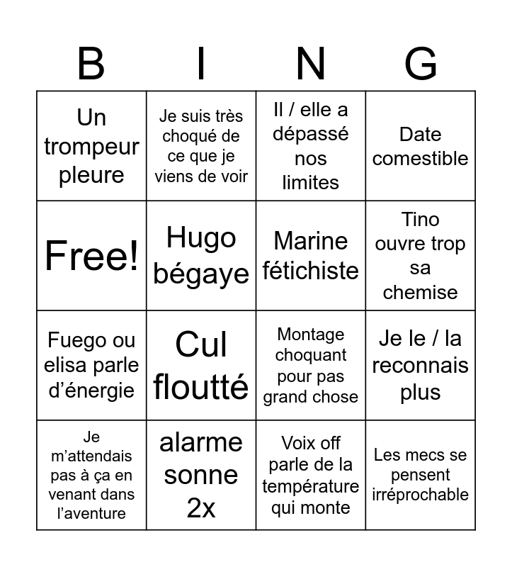 This bingo card has 16 words: alarme sonne 2x, Je le / la reconnais plus, Il / elle a dépassé nos limites, Un trompeur pleure, Fuego ou elisa parle d’énergie, Je suis très choqué de ce que je viens de voir, Montage choquant pour pas grand chose, Voix off parle de la température qui monte, Free!, Hugo bégaye, Je m’attendais pas à ça en venant dans l’aventure, Date comestible, Cul floutté, Tino ouvre trop sa chemise, Marine fétichiste and Les mecs se pensent irréprochable.