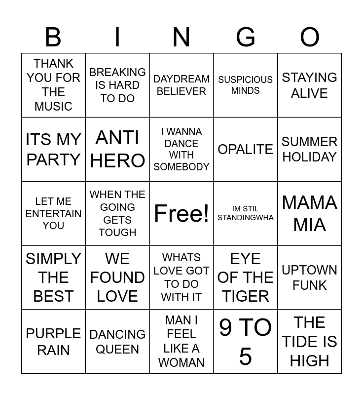 This bingo card has a free space and 43 words: BACK FOR GOOD, THE TIDE IS HIGH, LA BAMBA, PURPLE RAIN, HELP YOURSELF, 9 TO 5, DAYDREAM BELIEVER, HOW DEEP IS YOUR LOVE, STAYING ALIVE, DANCING QUEEN, SUSPICIOUS MINDS, IM STIL STANDINGWHA, WHATS LOVE GOT TO DO WITH IT, WE FOUND LOVE, GOOD LOOKING WOMAN, MAN I FEEL LIKE A WOMAN, JEANS ON, LET ME ENTERTAIN YOU, BACK TO BLACK, SUMMER HOLIDAY, BREAKING IS HARD TO DO, GOING TO IBIZA, THE GALWAY GIRL, THANK YOU FOR THE MUSIC, NEW YORK NEW YORK, MAMA MIA, BUILD ME UP BUTTER, GIMMIE A MAN AFTER MIDNIGHT, EYE OF THE TIGER, SIMPLY THE BEST, RIVERS OF BABYLON, UPTOWN FUNK, THE FATE OF OPHELA, WHEN THE GOING GETS TOUGH, BE THE ONE, DIE WITH A SMILE, GOLDEN, I WANNA DANCE WITH SOMEBODY, ITS MY PARTY, OPALITE, LADY IN RED, ANTI HERO and DANCING IN THE DARK.