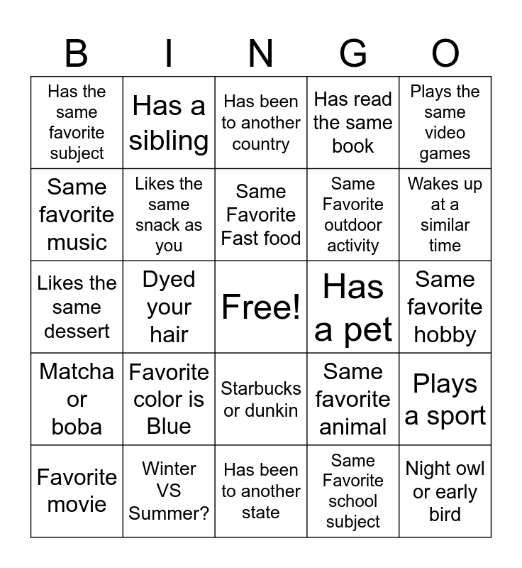 This bingo card has a free space and 24 words: Favorite color is Blue, Winter VS Summer?, Same Favorite Fast food, Favorite movie, Plays the same video games, Has the same favorite subject, Same favorite music, Has a sibling, Has a pet, Starbucks or dunkin, Same Favorite outdoor activity, Likes the same dessert, Same favorite animal, Plays a sport, Likes the same snack as you, Same Favorite school subject, Same favorite hobby, Has been to another country, Wakes up at a similar time, Dyed your hair, Night owl or early bird, Matcha or boba, Has read the same book and Has been to another state.