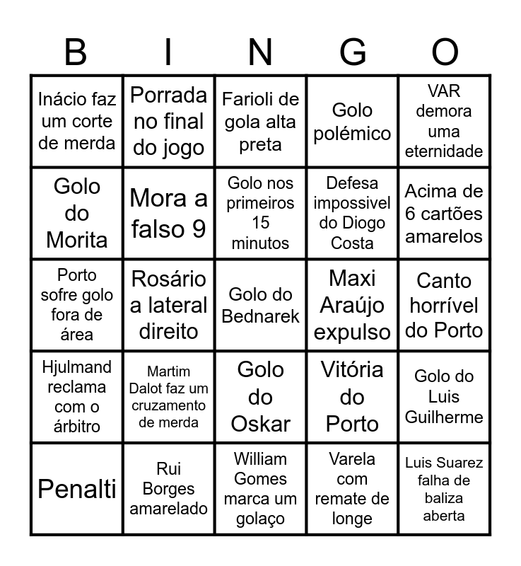 This bingo card has 25 words: Martim Dalot faz um cruzamento de merda, William Gomes marca um golaço, Golo nos primeiros 15 minutos, Penalti, VAR demora uma eternidade, Inácio faz um corte de merda, Golo do Morita, Porrada no final do jogo, Maxi Araújo expulso, Golo do Oskar, Defesa impossivel do Diogo Costa, Porto sofre golo fora de área, Vitória do Porto, Golo do Luis Guilherme, Mora a falso 9, Luis Suarez falha de baliza aberta, Canto horrível do Porto, Farioli de gola alta preta, Acima de 6 cartões amarelos, Rosário a lateral direito, Golo do Bednarek, Rui Borges amarelado, Hjulmand reclama com o árbitro, Golo polémico and Varela com remate de longe.