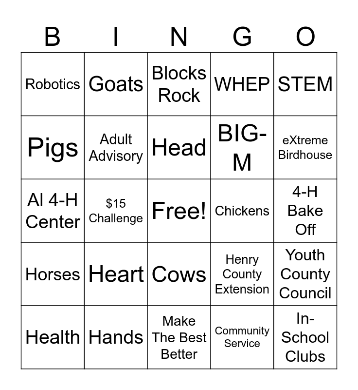 This bingo card has a free space and 24 words: Heart, Hands, Head, Health, STEM, Robotics, Pigs, Goats, Chickens, Cows, BIG-M, Al 4-H Center, Henry County Extension, Youth County Council, Adult Advisory, Community Service, 4-H Bake Off, Blocks Rock, eXtreme Birdhouse, $15 Challenge, In-School Clubs, Horses, WHEP and Make The Best Better.