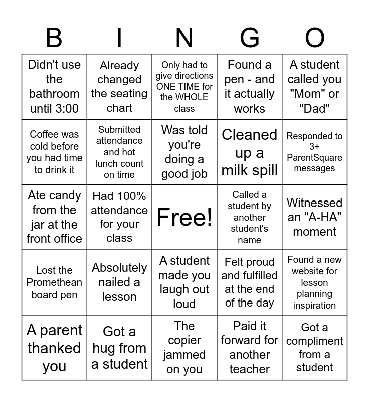 This bingo card has a free space and 24 words: Absolutely nailed a lesson, Got a hug from a student, Was told you're doing a good job, A parent thanked you, A student called you "Mom" or "Dad", Didn't use the bathroom until 3:00, Coffee was cold before you had time to drink it, Already changed the seating chart, Called a student by another student's name, A student made you laugh out loud, Cleaned up a milk spill, Ate candy from the jar at the front office, Felt proud and fulfilled at the end of the day, Found a new website for lesson planning inspiration, Submitted attendance and hot lunch count on time, Paid it forward for another teacher, Witnessed an "A-HA" moment, Only had to give directions ONE TIME for the WHOLE class, Responded to 3+ ParentSquare messages, Had 100% attendance for your class, Got a compliment from a student, Lost the Promethean board pen, Found a pen - and it actually works and The copier jammed on you.
