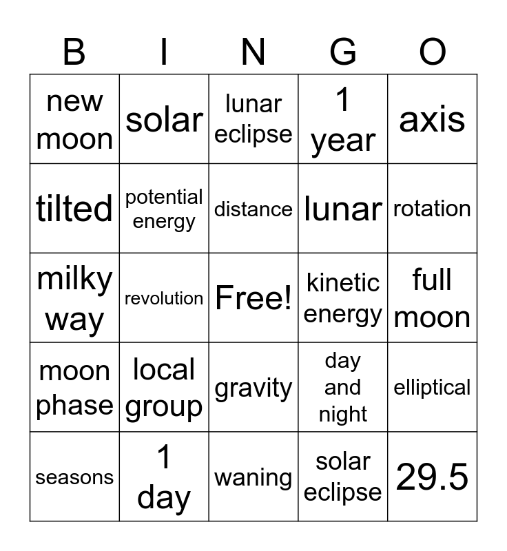 This bingo card has a free space and 27 words: day and night, spiral, lunar, waning, tilted, lunar eclipse, solar, moon phase, kinetic energy, elliptical, milky way, 1 year, seasons, 1 day, rotation, orbit, potential energy, distance, local group, new moon, full moon, solar eclipse, revolution, 29.5, gravity, axis and waxing.