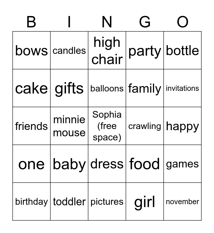This bingo card has a free space and 24 words: baby, toddler, balloons, birthday, bottle, bows, cake, candles, crawling, dress, family, friends, food, games, gifts, girl, happy, high chair, invitations, minnie mouse, november, one, party and pictures.