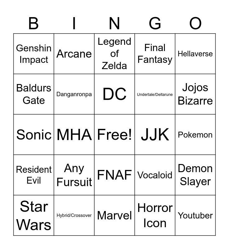 This bingo card has a free space and 25 words: Any Fursuit, Marvel, DC, Star Wars, Hellaverse, Genshin Impact, Baldurs Gate, Arcane, JJK, FNAF, Undertale/Deltarune, Sonic, Vocaloid, Demon Slayer, Danganronpa, Kpop Demon Hunters, Pokemon, Legend of Zelda, Jojos Bizarre, MHA, Youtuber, Hybrid/Crossover, Resident Evil, Final Fantasy and Horror Icon.