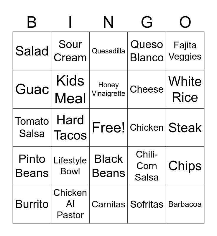 This bingo card has a free space and 29 words: Burrito, Burrito Bowl, Hard Tacos, Soft Tacos, Salad, Quesadilla, Kids Meal, Lifestyle Bowl, Chicken, Chicken Al Pastor, Steak, Barbacoa, Carnitas, Sofritas, White Rice, Brown Rice, Black Beans, Pinto Beans, Fajita Veggies, Tomato Salsa, Chili-Corn Salsa, Tomatillo Salsa, Cheese, Guac, Queso Blanco, Sour Cream, Chips, Honey Vinaigrette and Tortilla.