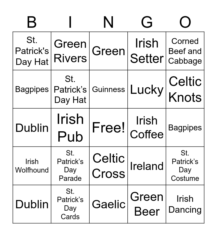 This bingo card has a free space and 75 words: Leprechaun, Shamrock, Green, Pot of Gold, Irish Flag, St. Patrick, Clovers, Rainbow, Ireland, Celtic Knots, Lucky, Four-Leaf Clover, Guinness, Bagpipes, Green Beer, Irish Pub, Parade, Irish Dancing, Irish Music, Corned Beef and Cabbage, Blarney Stone, Dublin, St. Patrick’s Day Hat, Green Rivers, Irish Setter, Leprechaun, Shamrock, Green, Pot of Gold, Irish Flag, St. Patrick, Clovers, Rainbow, Ireland, Celtic Knots, Lucky, Four-Leaf Clover, Guinness, Bagpipes, Green Beer, Irish Pub, Parade, Irish Dancing, Irish Music, Corned Beef and Cabbage, Blarney Stone, Dublin, St. Patrick's Day Hat, Green Rivers, Irish Setter (dog breed), Harp, Celtic Cross, "Kiss Me, I’m Irish", Gold Coins, St. Patrick's Day March 17th, Soda Bread, Celtic Cross, Fiddle, Claddagh Ring, Irish Blessing, St. Patrick’s Day Parade, Shamrock Shake, Celtic Music, Ireland's National Anthem, Leprechaun Trap, Irish Coffee, Tartan, St. Brigid’s Cross, Emerald Isle, St. Patrick’s Day Costume, Irish Wolfhound, St. Patrick’s Day Cards, Ireland’s Ancient East, Gaelic and St. Patrick’s Day Party.