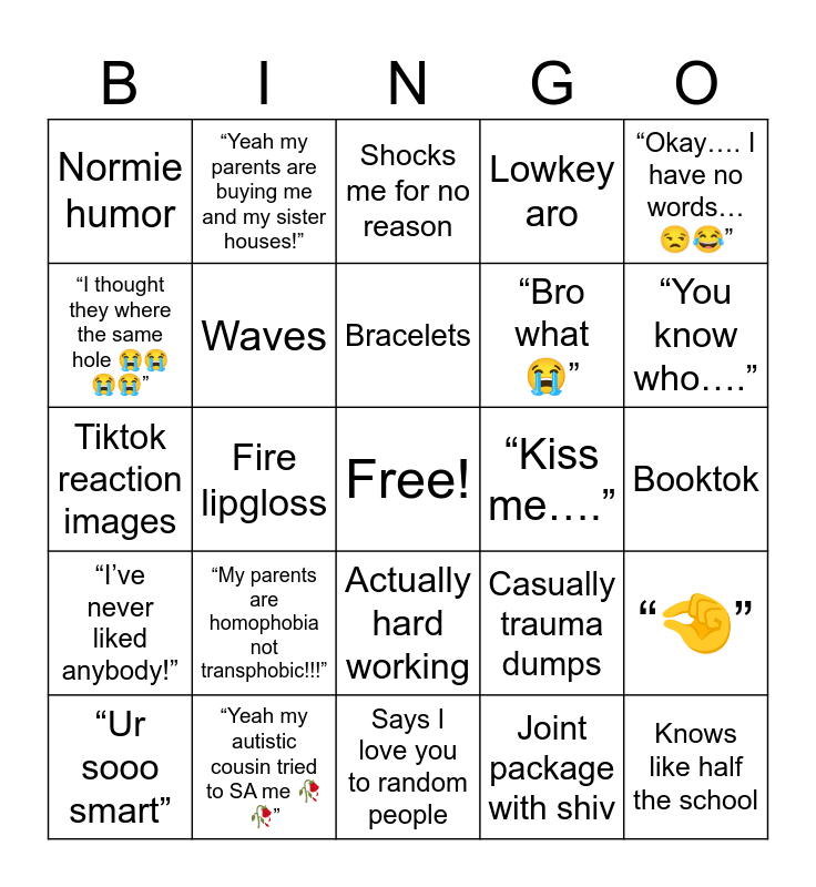 This bingo card has a free space and 24 words: “My parents are homophobia not transphobic!!!”, “Yeah my autistic cousin tried to SA me 🥀🥀”, Bracelets, “Ur sooo smart”, “Okay…. I have no words… 😒😂”, Normie humor, “I thought they where the same hole 😭😭😭😭”, “Yeah my parents are buying me and my sister houses!”, “Kiss me….”, Actually hard working, “Bro what 😭”, Tiktok reaction images, Casually trauma dumps, “🤏”, Waves, Joint package with shiv, Booktok, Shocks me for no reason, “You know who….”, Fire lipgloss, Knows like half the school, “I’ve never liked anybody!”, Lowkey aro and Says I love you to random people.
