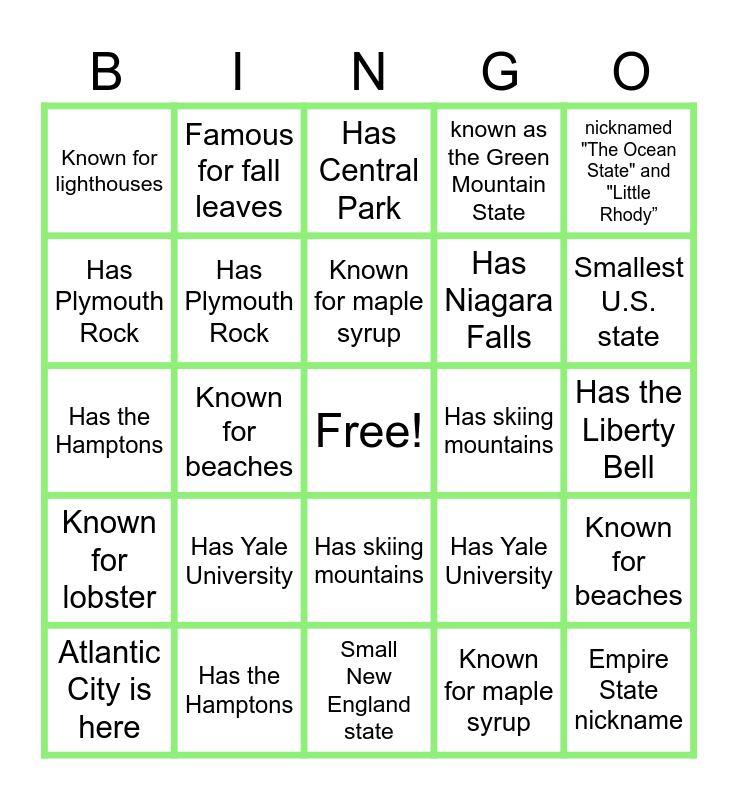 This bingo card has a free space and 49 words: Known for lobster, Smallest U.S. state, Has Times Square, Known for maple syrup, Has the Liberty Bell, Garden State nickname, Famous for fall leaves, Boston Tea Party history, Has Niagara Falls, Home of Hershey Chocolate, Has Plymouth Rock, Known for beaches, Has Yale University, Empire State nickname, First state to ratify Constitution, Known for clam chowder, Has Central Park, Has skiing mountains, Atlantic City is here Historic Independence Hall, Known for lighthouses, Has the Hamptons, Small New England state, known as the Green Mountain State, nicknamed "The Ocean State" and "Little Rhody”, Boston Tea Party history, Has Yale University, Known for maple syrup, Garden State nicknamed, Known for beaches, Known for lobster, Has Niagara Falls, Has skiing mountains, Empire State nickname, Known for clam chowder, Atlantic City is here, Famous for fall leaves, Known for lighthouses, First state to ratify Constitution, Smallest U.S. state, Small New England state, Historic Independence Hall, Has the Liberty Bell, Home of Hershey Chocolate, Has Central Park, Has the Hamptons, Has Plymouth Rock, Has Times Square, known as the Green Mountain State and Nicknamed The Ocean State and Little Rhody.