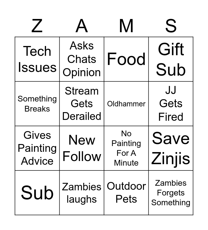 This bingo card has 16 words: Zambies laughs, Save Zinjis, Food, Tech Issues, Gives Painting Advice, Asks Chats Opinion, No Painting For A Minute, Outdoor Pets, Something Breaks, Stream Gets Derailed, Sub, Gift Sub, New Follow, JJ Gets Fired, Oldhammer and Zambies Forgets Something.
