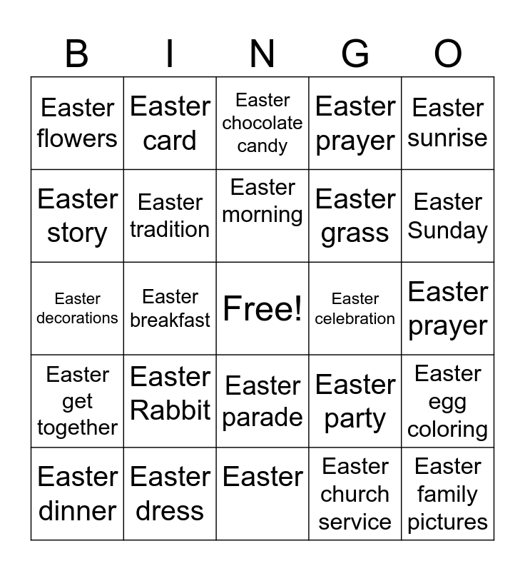 This bingo card has a free space and 24 words: Easter Rabbit, Easter dress, Easter morning, Easter dinner, Easter sunrise, Easter flowers, Easter story, Easter card, Easter celebration, Easter parade, Easter grass, Easter decorations, Easter party, Easter egg coloring, Easter tradition, Easter church service, Easter prayer, Easter chocolate candy, Easter Sunday, Easter breakfast, Easter family pictures, Easter get together, Easter prayer and Easter.